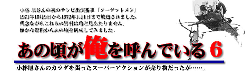 高度15メートル、時速30キロのヘリコプターから小林旭がナマ身を空中にさらし地上を走るトラックに飛び降りた。12日埼玉県・浦和市郊外で行われたNETの新番組「ターゲットメン」(10月9日スタート、土曜午後8:00)でのアクション・シーン。格闘あり、撃ち合いありの本格的アクションに、小林旭は「ヘビー級のスリルをお見せすると、胸を張って“マイトガイ復活宣言”をやってのけた。